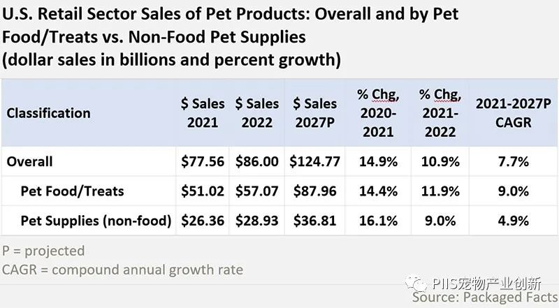 Packaged Facts将宠物食品和零食产品的销售额与宠物用品的销售额进行了比较,详细说明了美国2021年至2022年宠物食品/零食的销售额增长了11.9%,同期宠物用品的销量增长了9%。