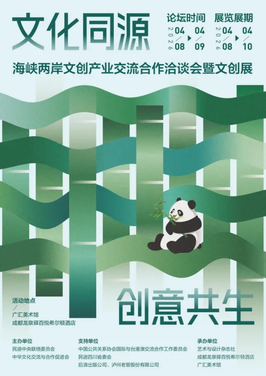 春风润蓉城,文脉连两岸。2026年4月8日,由民进中央联络委员会、中华文化交流与合作促进会联合主办,艺术与设计杂志社、广汇美术馆、成都龙泉驿百悦希尔顿酒店共同承办,中国公共关系协会国际与台港澳交流合作工作委员会等单位支持协办的“文化同源·创意共生”海峡两岸文创产业交流合作会议暨文创展在成都广汇美术馆隆重举行。本次活动以中华优秀传统文化为根基,以文创产业为纽带,汇聚海峡两岸专家领导、文化学者、设计名家、行业翘楚、高校代表与品牌机构,通过精品展览、主旨论坛、主题演讲、产业交流等多元形式,全方位展现两岸文创成果,深层次推动文化交流互鉴,多角度探索产业合作路径,为两岸文化融合发展搭建起高规格、专业化、沉浸式的交流平台。本次活动邀请了来自台湾的38名嘉宾和文创业界代表参会并参访交流,其中有2位是首次来大陆。他们共带来了219件文创作品参加此次文创展。
