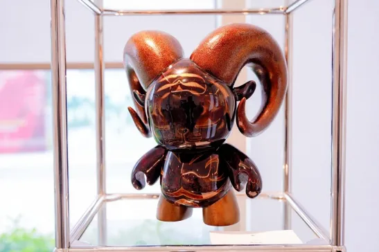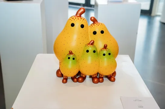 在展厅核心区域,两件主题作品成为全场焦点。艺术家张超级带来的《永不分梨》系列作品,以“梨”谐音“离”为创意核心,用色彩明快、造型可爱的艺术形象,传递两岸同胞亲如一家、血脉相连、永不分离的深厚情感,兼具艺术感染力与情感共鸣;庞飞创作的《你被财神偷偷盯上了》深度融合成都本土文化,以麻将为创作原型,镌刻“发”字符号,贴合城市生活肌理,以幽默治愈的艺术风格,展现天府文化乐观向上的精神内核,为展览增添了浓郁的烟火气息。