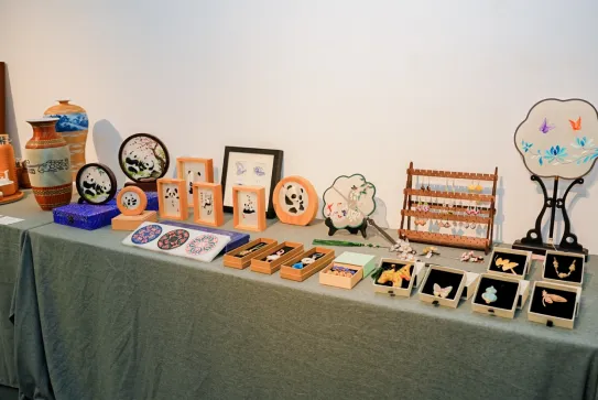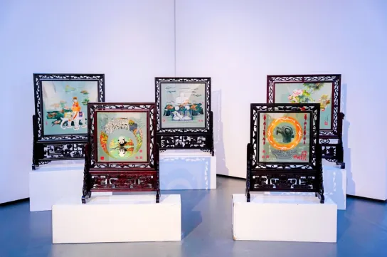 天府文创板块充分彰显巴蜀文化底蕴与本土文创活力,汇聚本土设计师、高校团队与助残公益品牌作品。其中,知名蜀绣艺术家马开琪的蜀绣作品尤为亮眼,作为深耕蜀绣领域多年的匠人,她精通蜀绣十二大类、百余种针法,擅长将工笔重彩风格与蜀绣技艺相融,此次参展作品延续其严谨细腻、色彩明快的艺术特色,以软缎、彩丝为原料,运用晕、纱、滚等经典蜀绣技法,细腻勾勒出熊猫、花鸟等兼具巴蜀特色与文化内涵的意象,针脚整齐、掺色轻柔,将蜀绣“光亮平整、浑厚圆润”的独特韵味展现得淋漓尽致。成都年轻的设计师何召成、马谦谦《六只熊猫》系列文创,以图形创意诠释人与自然共生、两岸同根同源的理念,衍生产品兼具实用性与时尚感;四川师范大学美术学院“天府百工”系列作品,涵盖蜀绣、竹编、漆艺等国家级非遗项目,以当代设计语言激活传统技艺;四川农业大学艺术与传媒学院带来吞口、胎瓷、彝族漆器等作品,扎根西南民族文化土壤,推动民族工艺创新发展;南华蝶助残品牌将非遗技艺与残疾人手工创作相结合,推出熊猫玩偶、蜀绣摆件等作品,在传承文化的同时传递公益温度,彰显人文关怀。