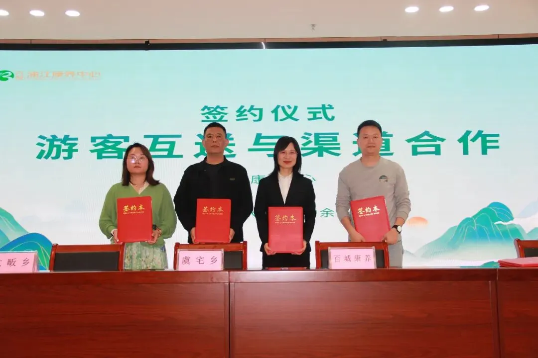 现场签约环节亮点纷呈,百城浦江康养中心与全国旅游热线联盟签订合作协议,拓宽全国客源渠道;与虞宅、大畈、中余三乡及3家种植基地达成引流及产销合作,推动“康养+乡村”“康养+农业”深度融合,助力乡村共富。其中,百城康养中心与旅行社、村居型基地、种养殖基地签订12份订单,承诺年内引流10万人次,预计营收1000余万元,向村居型基地分流8万人次,购销农副产品500万元。