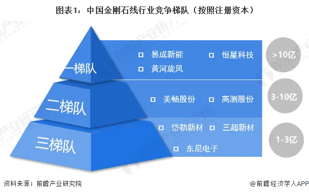从金刚石线行业竞争梯队看,易成新能、黄河旋风、恒星科技注册资本超过10亿元,处于第一梯队位置;美畅股份和高测股份注册资本在3-10亿元之间,处于第二梯队;岱勒新材、三超新材和东尼电子注册资本在1-3亿元之间,处于第三梯队。