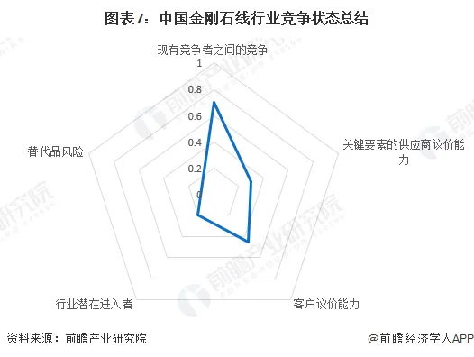 根据以上分析,对各方面的竞争情况进行量化,1代表最大,0代表最小,目前我国金刚石线行业五力竞争总结如下: