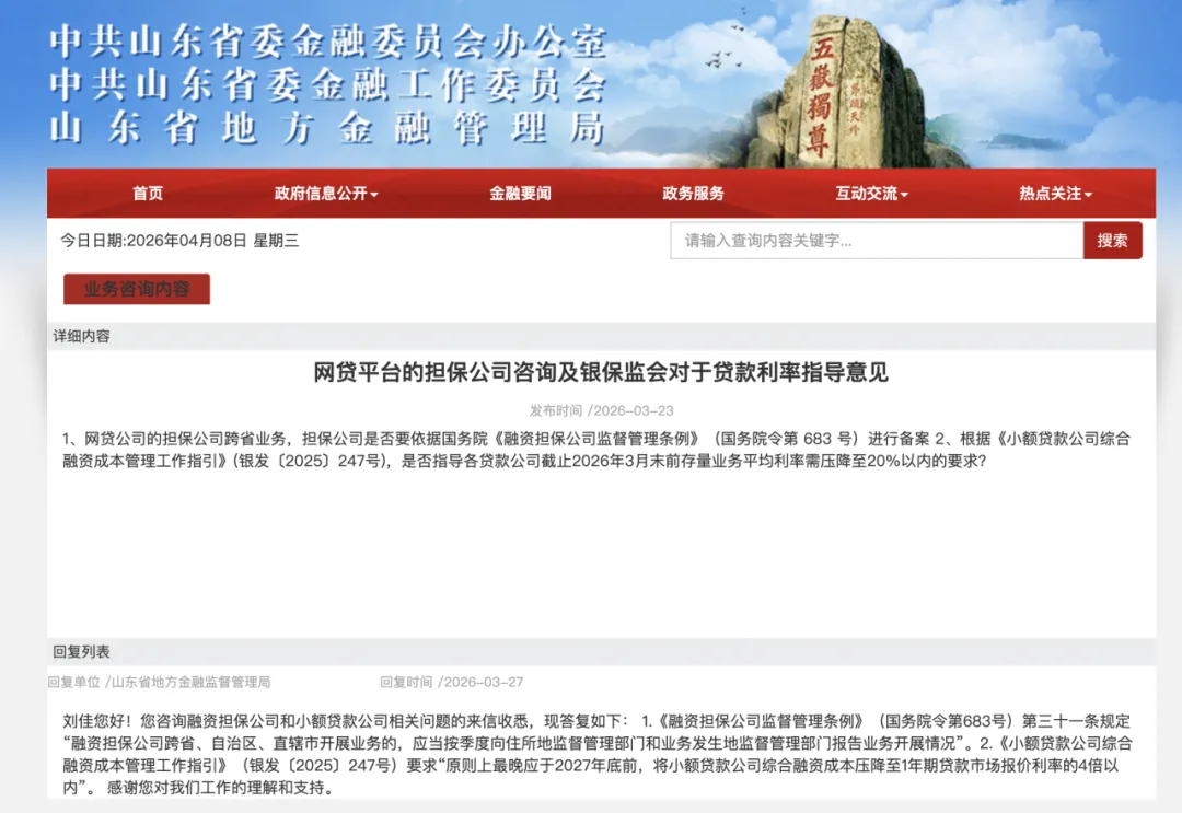 2026年3月27日,山东省地方金融局在官网上回复网友提问时,再次确认了这个时间点。他们明确表示,山东省内的小贷公司必须在2027年底前完成综合融资成本的压降工作,降到一年期LPR的4倍以内。这是地方金融监管部门第一次通过官方公开回复的方式,向市场和小贷公司说清楚这项政策怎么落地。