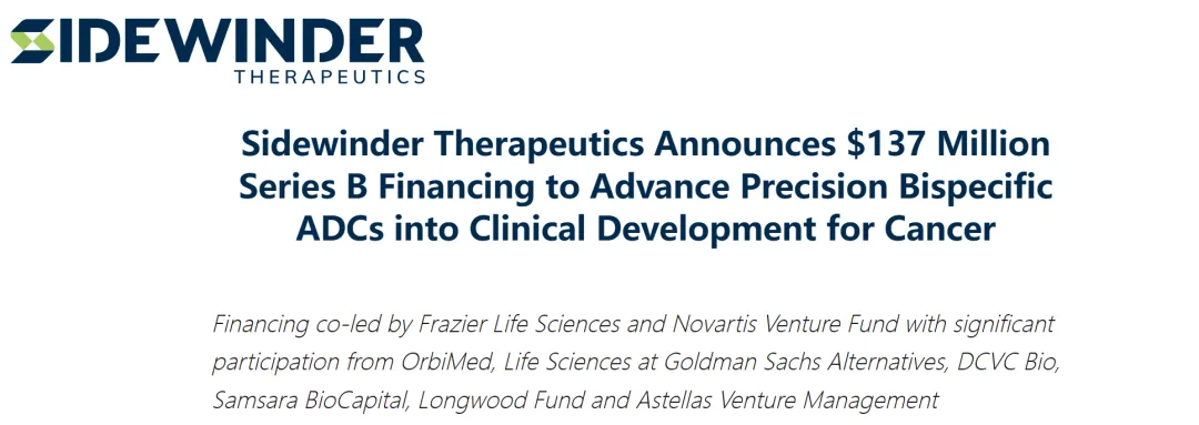 2026年4月8日,Sidewinder Therapeutics,一家专注于开发下一代双特异性ADC(抗体偶联药物)用于治疗癌症的生物制药公司,宣布完成超额认购的1.37亿美元B轮融资。本轮由Frazier Life Sciences和Novartis Venture Fund联合领投,A轮唯一投资方OrbiMed及高盛另类投资生命科学部、DCVC Bio、Samsara BioCapital、Longwood Fund、Astellas Venture Management和Alexandria Venture Investments等新投资者共同参与;与此同时,来自Frazier Life Sciences的Daniel Estes博士、Novartis Venture Fund的Michal Silverberg、高盛另类投资生命科学部的Josh Richardson医学博士以及DCVC Bio的John Hamer博士被任命为公司董事会成员。Sidewinder的使命聚焦于开发靶向某些实体瘤高表达受体复合物的双特异性ADC,其管线由内部发现的抗体序列工程化构建而成,经精细优化以靶向由致癌驱动受体和内吞受体组成的肿瘤特异性复合物,通过精准靶向这些复合物增强肿瘤细胞特异性和内化作用,从而改善药物向癌细胞的递送并避免损伤正常细胞;公司项目旨在解决治疗选择有限且患者群体庞大的肿瘤适应症,如肺癌和头颈癌的鳞状细胞癌以及结直肠癌等消化道癌症,并预计于2027年将其领先项目推进至临床开发阶段。“我们很高兴获得这一杰出投资者群体的支持,以及他们对我们推进Sidewinder任务的共同热情,即开发用于治疗难治性癌症的下一代双特异性ADC,”Sidewinder Therapeutics联合创始人兼首席执行官Eric Murphy博士表示。“ADC领域正处于一个转折点,技术突破推动了下一代双特异性ADC的发展,Sidewinder渴望引领这一创新浪潮,并为癌症患者推进有前景的疗法。”2026年1月,龙沙旗下Synaffix和Sidewinder Therapeutics已签订多靶点许可协议,开发一流的双特异性ADC治疗药物,用于治疗实体瘤适应症。Synaffix专注于将其临床阶段平台技术商业化,以开发具有一流治疗指数的ADC药物。Sidewinder成立于2023年,由OrbiMed支持,总部位于圣地亚哥,已从世界级投资财团筹集了总计1.62亿美元。生物药大时代组建了抗体药、疫苗、核酸药物等多个相关领域的实名制微信交流群,扫描下方二维码即可入群!