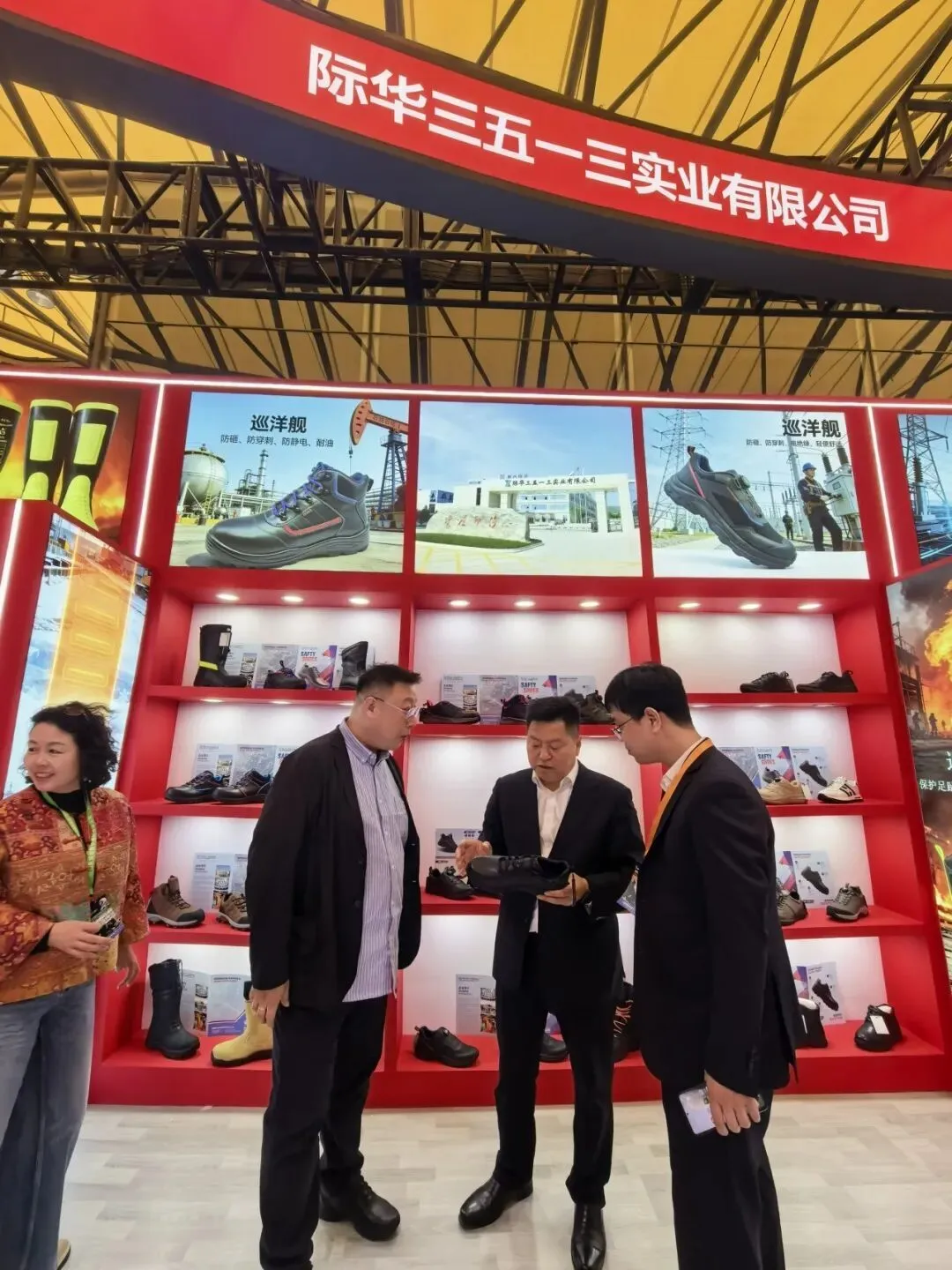 本次展会,公司以“科技赋能安全,匠心守护每一步”为主题,打造了沉浸式产品展示空间。展台以大气庄重的红色为主色调,搭配清晰的产品矩阵展示,全方位呈现了公司在防护鞋靴领域的全品类布局:从适用于电力行业的际华3513电绝缘功能鞋,到满足石油化工场景的防化靴、耐油靴;从矿山作业的防砸防刺穿安全鞋,到消防救援的专业消防靴;从户外作业的防寒保暖靴,到日常通勤的轻便防护鞋,每一款产品都凝聚着公司对安全防护的极致追求,吸引了众多国内外客商驻足咨询、洽谈合作。