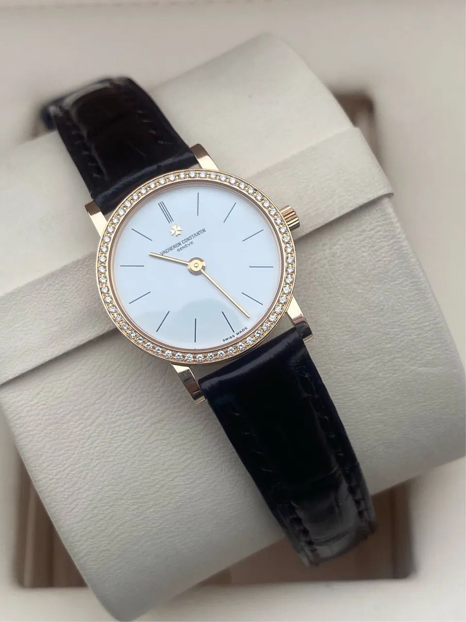 ?:45600元、江诗丹顿传承系列25593/000R-8741、女士精准石英腕表、表径:23.5mm、材质:18k玫瑰金/皮带、原装钻石镶嵌、白色盘面、密底、条刻黄金指针、针扣、全套附件、整表98新、参考同款原价:138000元