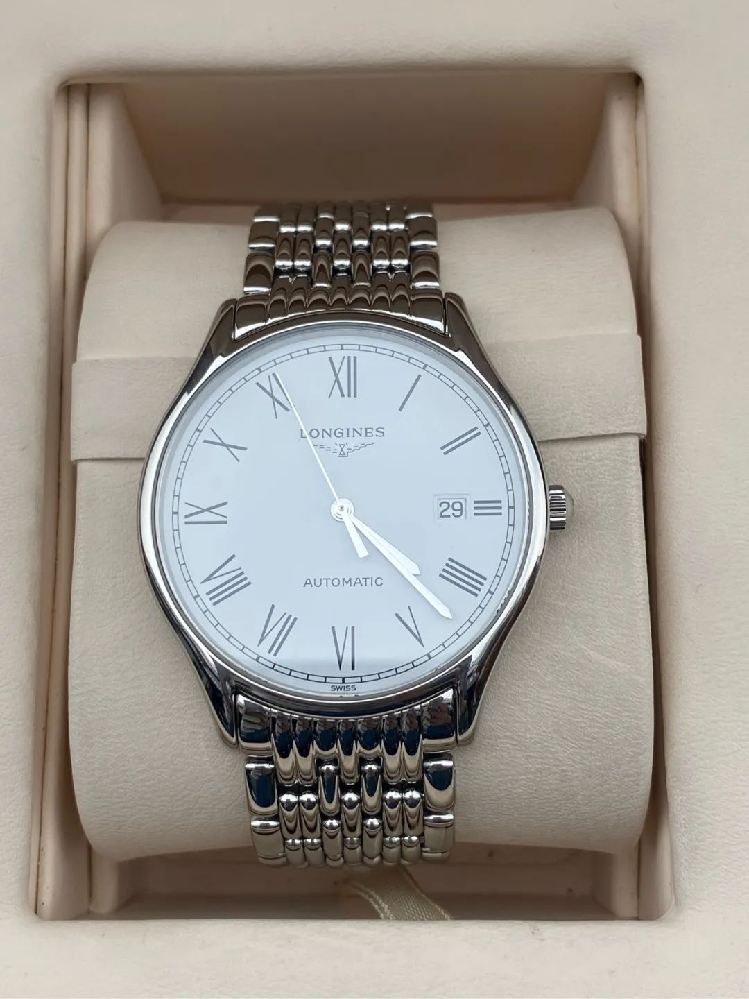 ?:6100元、浪琴律雅系列L4.960.4.11.6、男士自动机械腕表、表径:38.5mm、材质:精钢/钢带、白色盘面、罗马数字刻度、日期显示、单表98新成色、原价11300元
