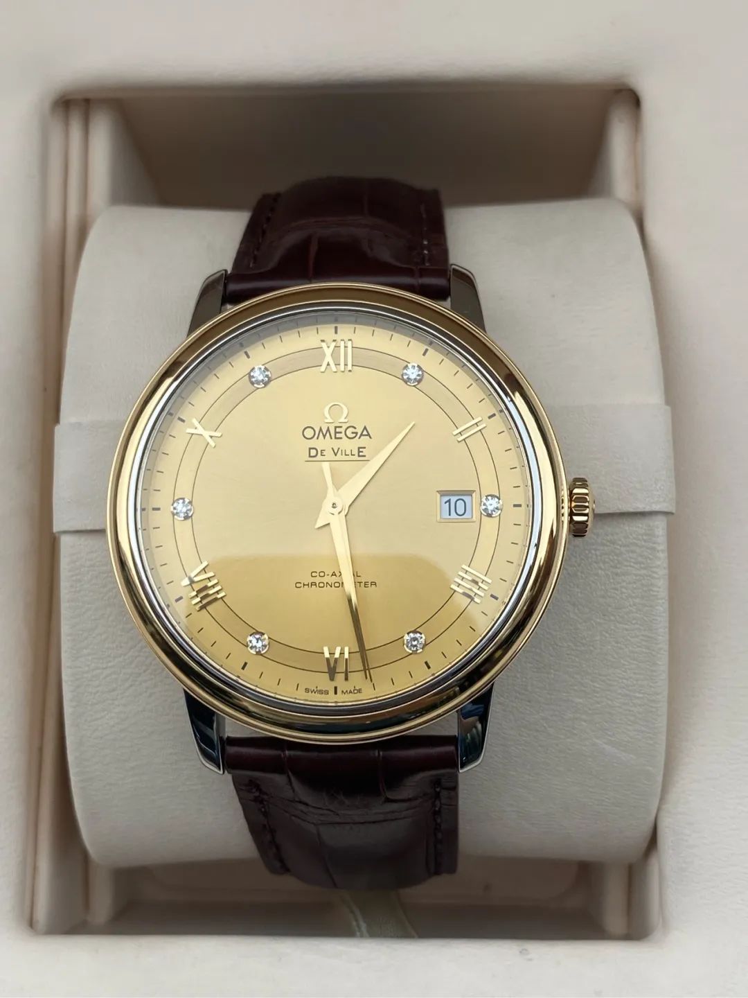 ?:24600元、欧米茄碟飞系列、424.23.40.20.58.001、男士自动机械腕表、表径:39.5mm、材质:18k黄金/精钢、鳄鱼皮带、香槟色轨道盘面、日期显示、罗马数字钻石刻度、单表97新成色、原价51600元