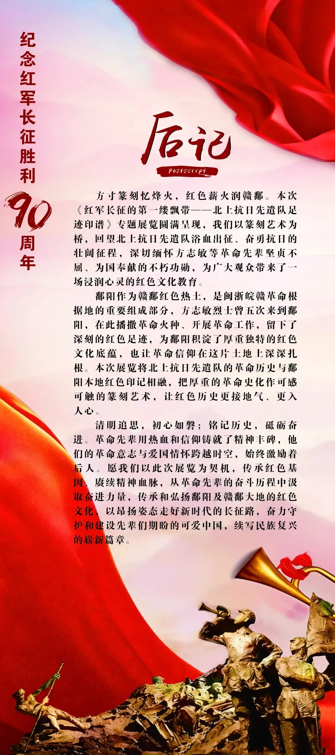 今年,是红军长征胜利90周年。为了纪念这个伟大的日子,也为了致敬最早踏上征途的那支英雄部队,鄱阳湖博物馆联手弋阳县博物馆共同举办《红军长征的第一缕飘带——北上抗日先遣队足迹印谱》。