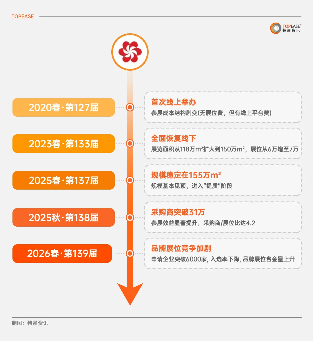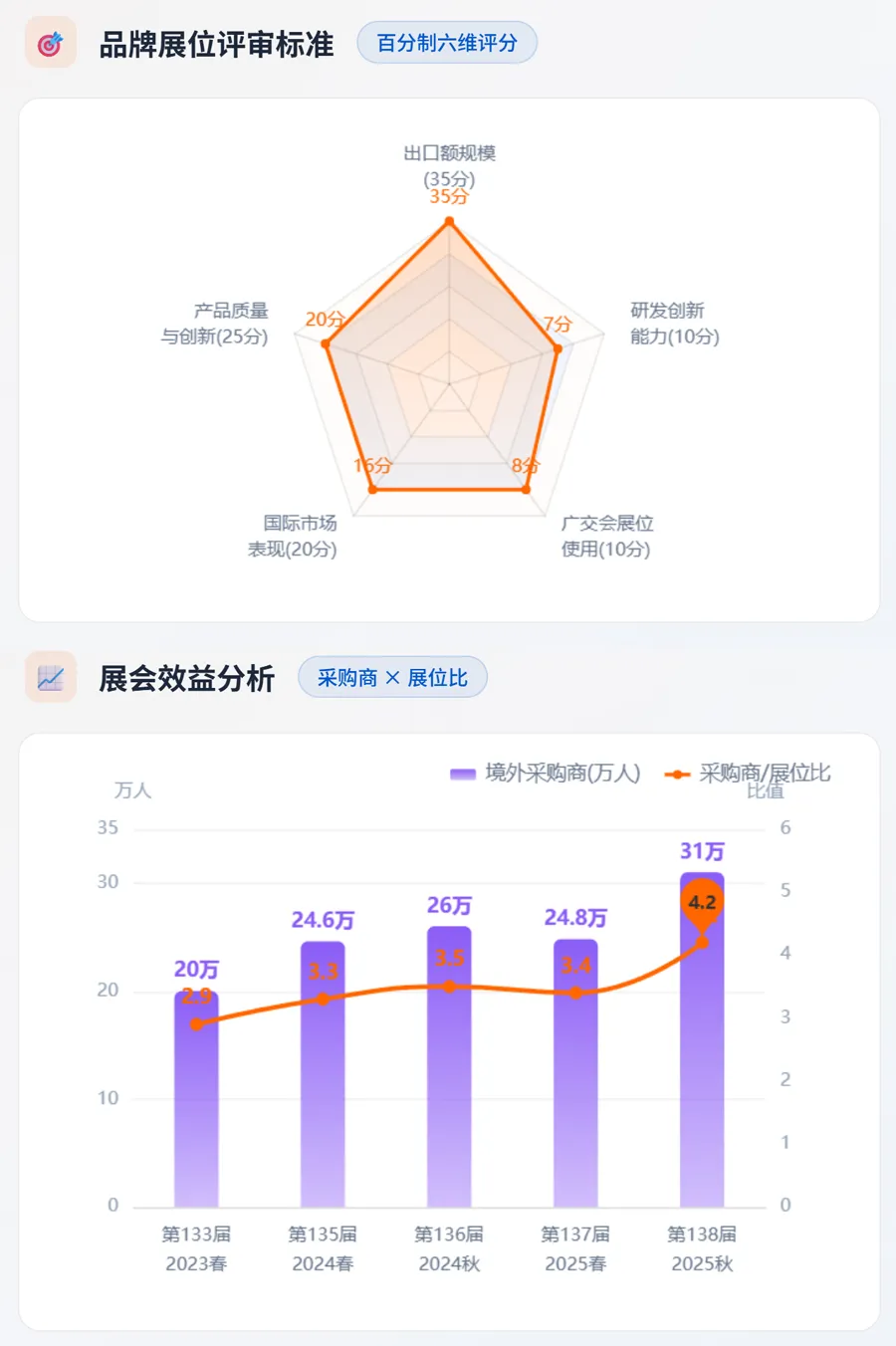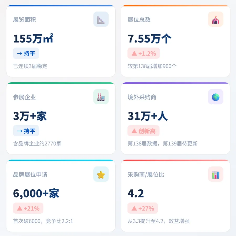 看似规模见顶的背后,是展会从 “扩量” 到 “提质” 的核心转变:境外采购商在上一届已突破 31 万人,采购商 / 展位比从 3.3 大幅提升至 4.2。