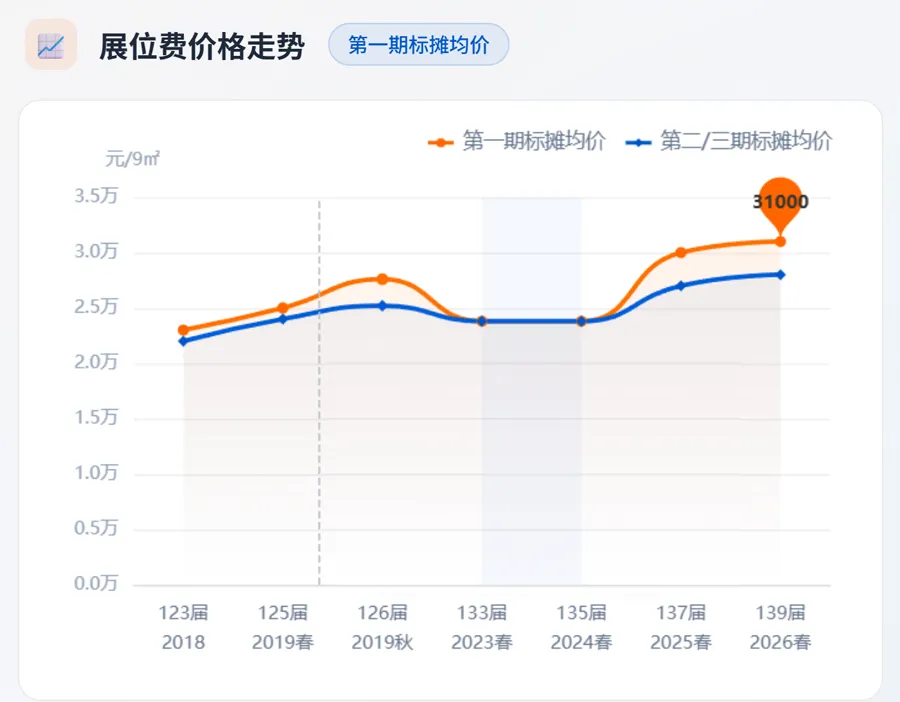 从历年展位费走势来看,2019 年第一期标摊最高价达2.88万元,疫情后曾下调至 2.38 万元,2025 年起已回升至 3 万元以上,且第一期电子、机械、车辆类展位始终价格最高,直接反映了行业的热度差异。