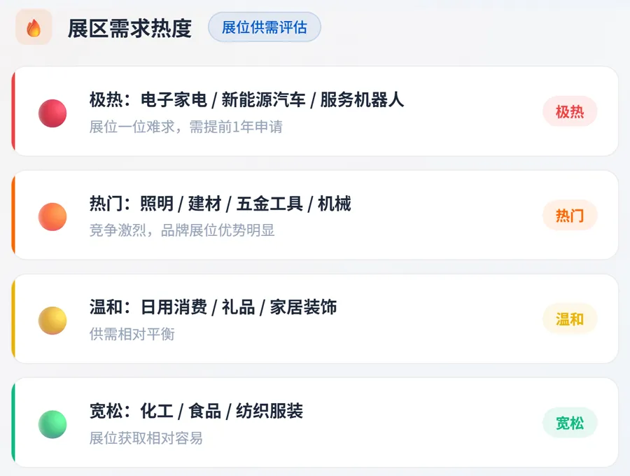 这也是为什么即便竞争比升至 2.2:1,依然有大量企业扎堆申请品牌展位 —— 优质展位带来的精准流量,是参展转化的核心基础。