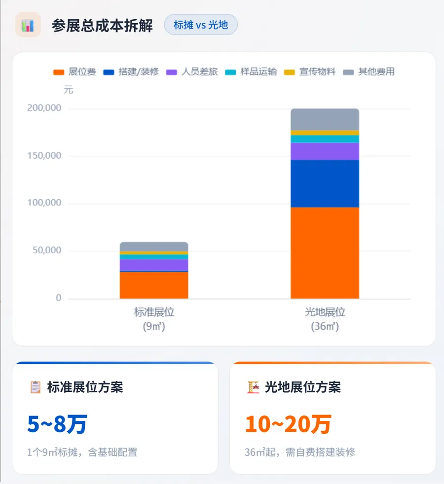 很多外贸人第一次参展,最容易踩的坑就是只盯着展位费,忽略了全链路的成本支出。从报告数据来看,参展预算有着清晰的基准线: