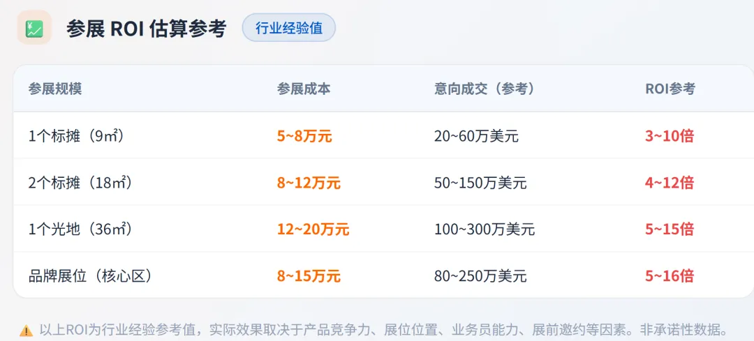 ROI 天花板有多高?所有外贸人最关心的核心问题,莫过于参展的投入产出比。1 个 9㎡标摊 5-8 万元的投入,对应 20-60 万美元的意向成交额,ROI 可达 3-10 倍。