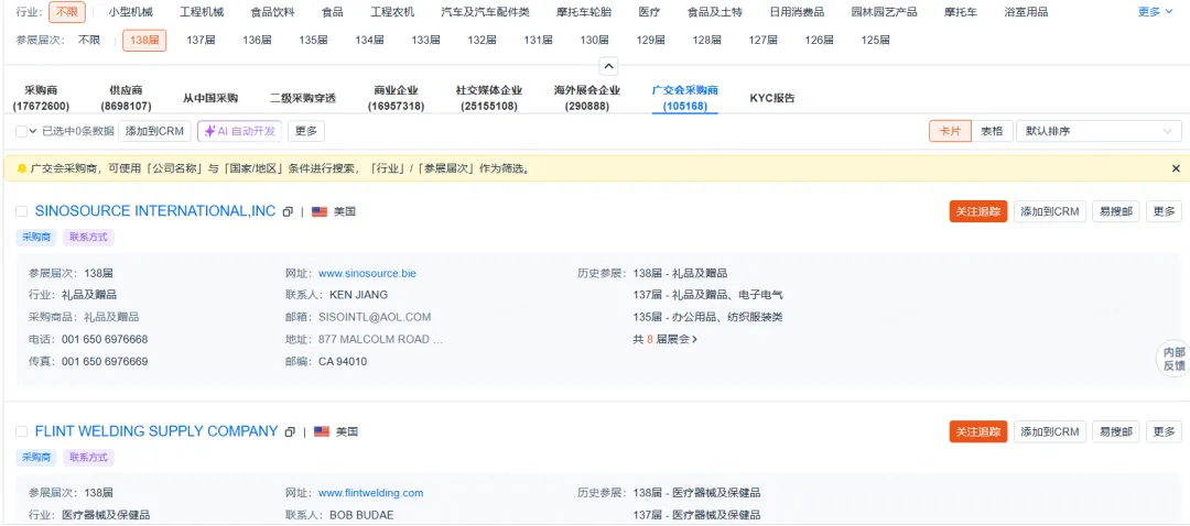 客户挖掘:基于海量贸易数据与AI智能推荐,企业可直接锁定历届广交会参展客户名单,了解其参展次数、贸易记录,实现精准触达。