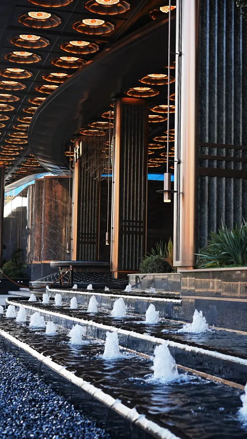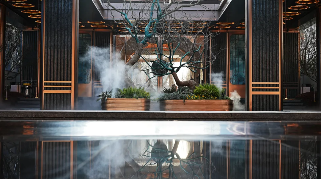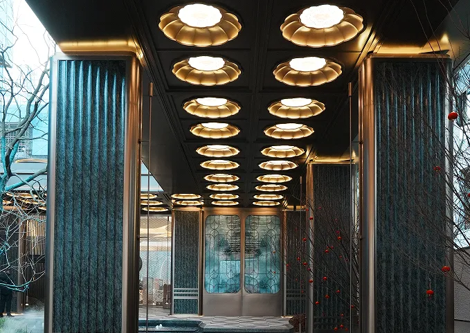 内造“四水归堂”格局,天井透光、乔木映景,步步生花过水汀步,踏水而行,步步生财。外侧六柱、内侧十柱,寓意“出门六顺,归家十全”。对景屏风为定制冰雕纹夹丝玻璃,青云意象丝丝入扣,美不胜收。