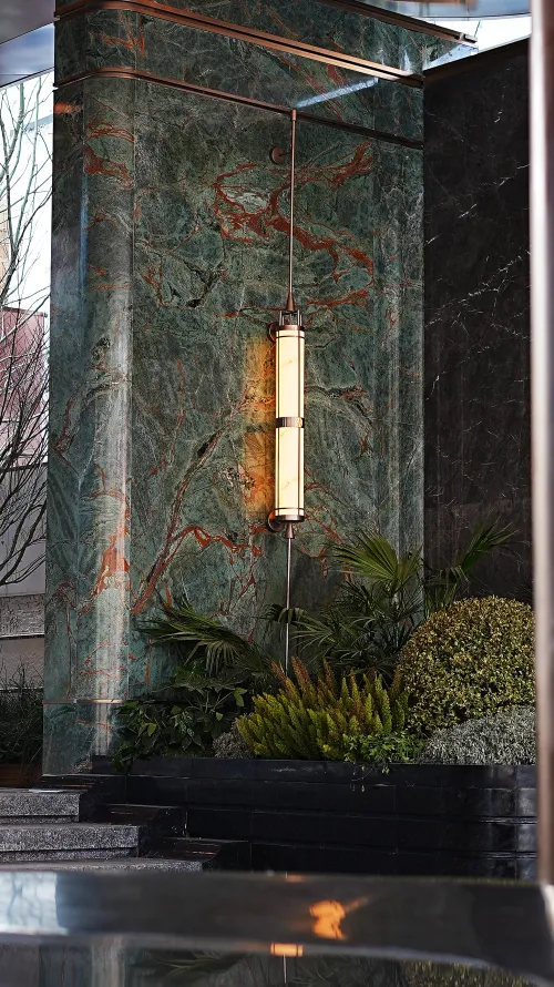 入口瑶台水景以幻影蓝石材铺就,悬月映水、意境空灵;景墙甄选百达翡绿奢石,地面臻采进口安哥拉黑石材精工铺装,肌理温润,质感卓然,于方寸之间尽显世家气度。