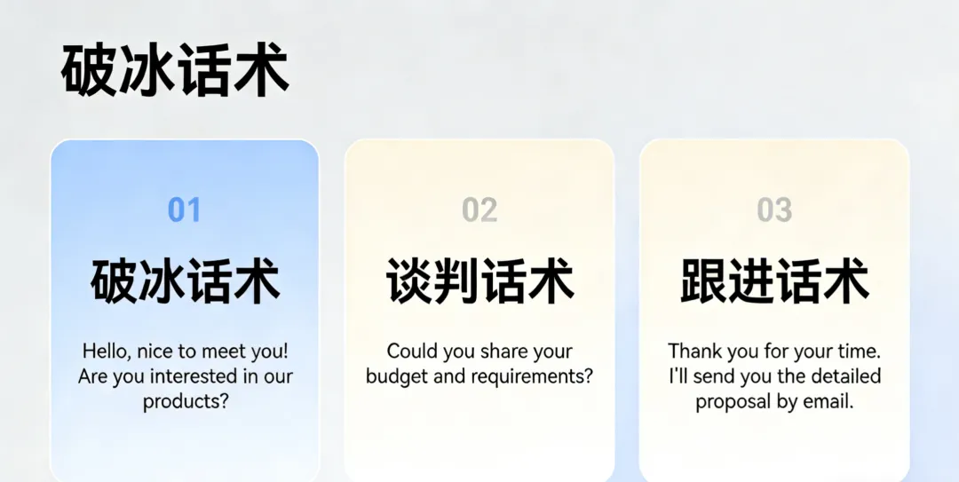 从客户进门的第一秒,到展会结束后的跟进,每一个环节、每一句话,都决定着你能不能把“名片”变成“订单”。本文结合2026年外贸展会最新实战逻辑,整理了展会全流程英语话术+落地打法,从破冰接待、公司实力背书、产品深度讲解、价格付款谈判、样品定制谈判、现场逼单转化、售后跟进7大维度,给出可直接背诵、直接复制的完整方案。无论你是零基础业务员,还是想提升业绩的老板,照着做,展会成交率至少翻一倍!