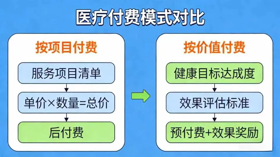 推动医保支付方式从“按项目付费”向 “按价值付费” 转型,核心是按人头打包付费与 “结余留用、超支分担” 的激励约束机制。