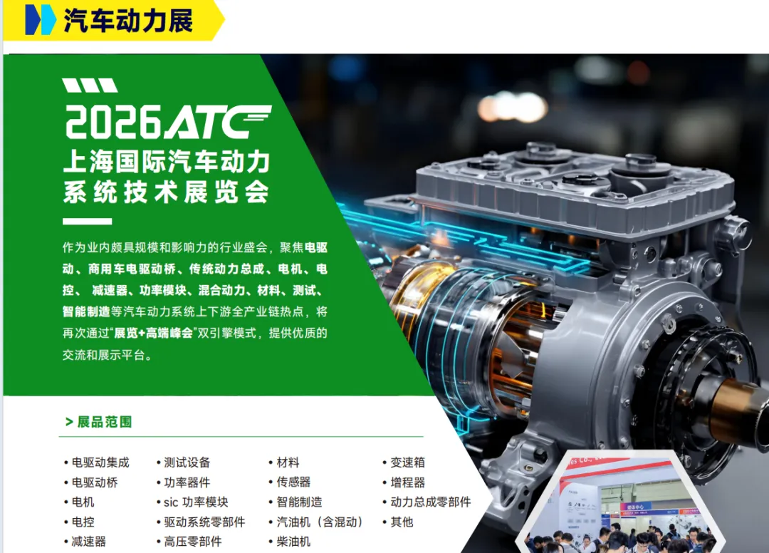 聚焦汽车动力系统的迭代升级,2026ATC汽车动力系统技术展全面呈现从传统内燃机优化到电驱动未来的全谱系动力解决方案。展区重点覆盖电驱动集成、电驱动桥、电机、电控、减速器、功率半导体(SiC、GaN)、混合动力、增程器、动力总成零部件等核心领域,探讨800V高压、多合一电驱、氢燃料电池等前沿技术,聚焦“动力猛、能耗低、可靠性高”的行业需求,展现动力系统从“独立模块”到“跨域融合”的发展趋势。