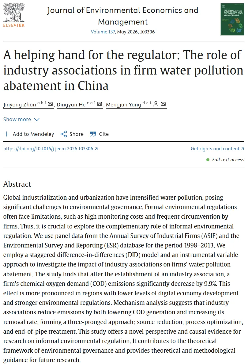 摘要:全球工业化与城市化进程加剧了水污染问题,给环境治理带来了严峻挑战。正式环境规制往往面临监测成本高昂、企业规避行为频发等局限性,因此,探索非正式环境规制的补充作用至关重要。本文利用1998至2013年中国工业企业年度调查(ASIF)与环境统计报告(ESR)数据库的面板数据,采用交错双重差分模型与工具变量法,实证检验了行业协会对企业水污染减排的影响。研究发现,行业协会成立后,企业化学需氧量(COD)排放量显著下降9.9%。这一减排效应在数字经济发展水平较低、环境规制力度较强的地区更为突出。机制分析表明,行业协会通过降低COD产生量与提高COD去除率两条路径实现减排,形成了“源头削减、过程优化、末端治理”三管齐下的治理模式。本研究为非正式环境规制领域提供了新颖的研究视角与因果证据,丰富了环境治理的理论框架,并为后续研究提供了理论与方法论的参考。(译者注:本文的核心数据源是民政部社会组织管理局主管的“中国社会组织公共服务平台”官方网址:https://xxgs.chinanpo.mca.gov.cn/gsxt/newList 。作者通过网络爬虫对平台公开登记信息进行系统性抓取,筛选出成立日期早于2013年底且登记状态正常的地级市社会团体记录,共获取近六千条工业类行业协会原始条目;在数据清洗阶段,研究者构建了覆盖制造业31个大类的关键词映射词库,例如将名称中含“纺织”、“印染”、“针织”的协会映射至CIC 17纺织业,将“造纸”、“纸浆”映射至CIC 22造纸业,同时提取名称中的地名信息对应城市代码,并剔除律师协会、餐饮协会等服务业组织,仅保留服务于工业企业的制造业行业协会样本;为规避“僵尸协会”的干扰,进一步剔除注册资金低于3万元的休眠组织,最终将每条协会记录转化为“城市—行业—年份”维度的二元虚拟变量,为后续交错双重差分模型的因果识别提供了政策干预) 原文信息:Zhan, Jinyong, Dingyan He, and Mengjun Yang. "A helping hand for the regulator: The role of industry associations in firm water pollution abatement in China." Journal of Environmental Economics and Management (2026): 103306.