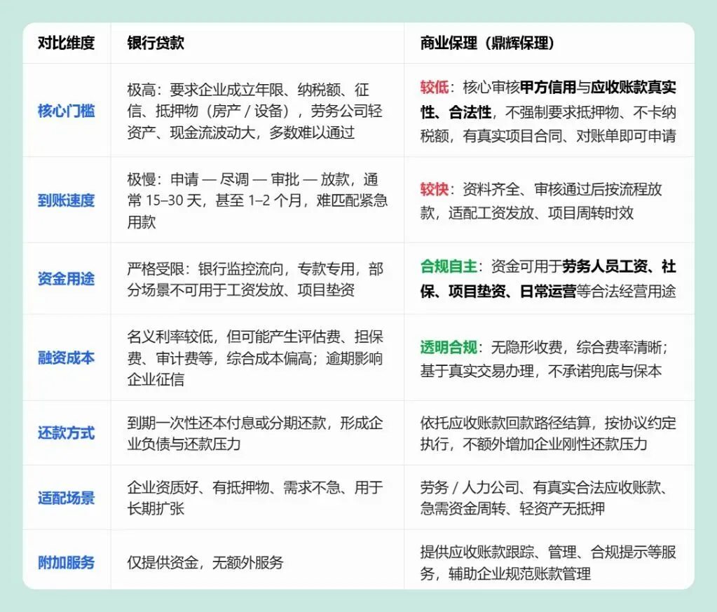 这是鼎辉保理针对劳务行业的核心设计:融资资金可合法用于劳务人员工资发放,符合行业监管要求,直接解决工资垫付痛点。