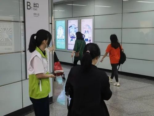 在R2线展览中心地铁站内的志愿者们,为群众提供购票咨询以及出站口指引等服务。