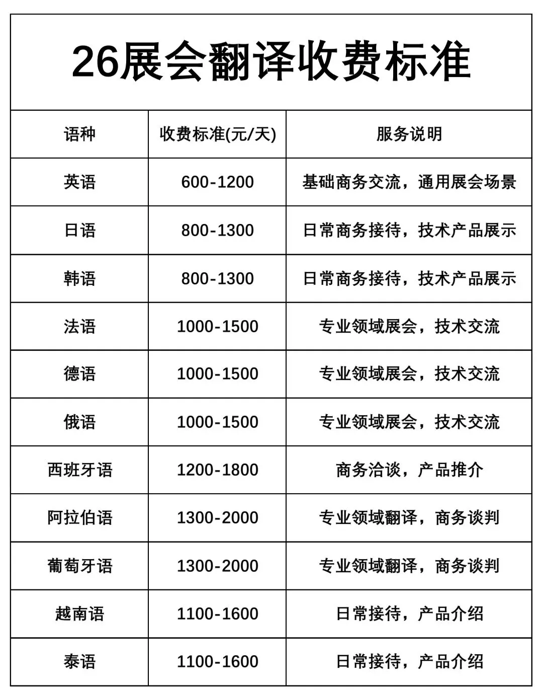 英语作为全球通用商务语言,是绝大多数展会的基础配置。600-1200 元 / 天的价格区间,性价比极高,可满足基础商务对接、客户咨询、产品介绍等通用场景,适合首次参展、面向全球市场的企业。