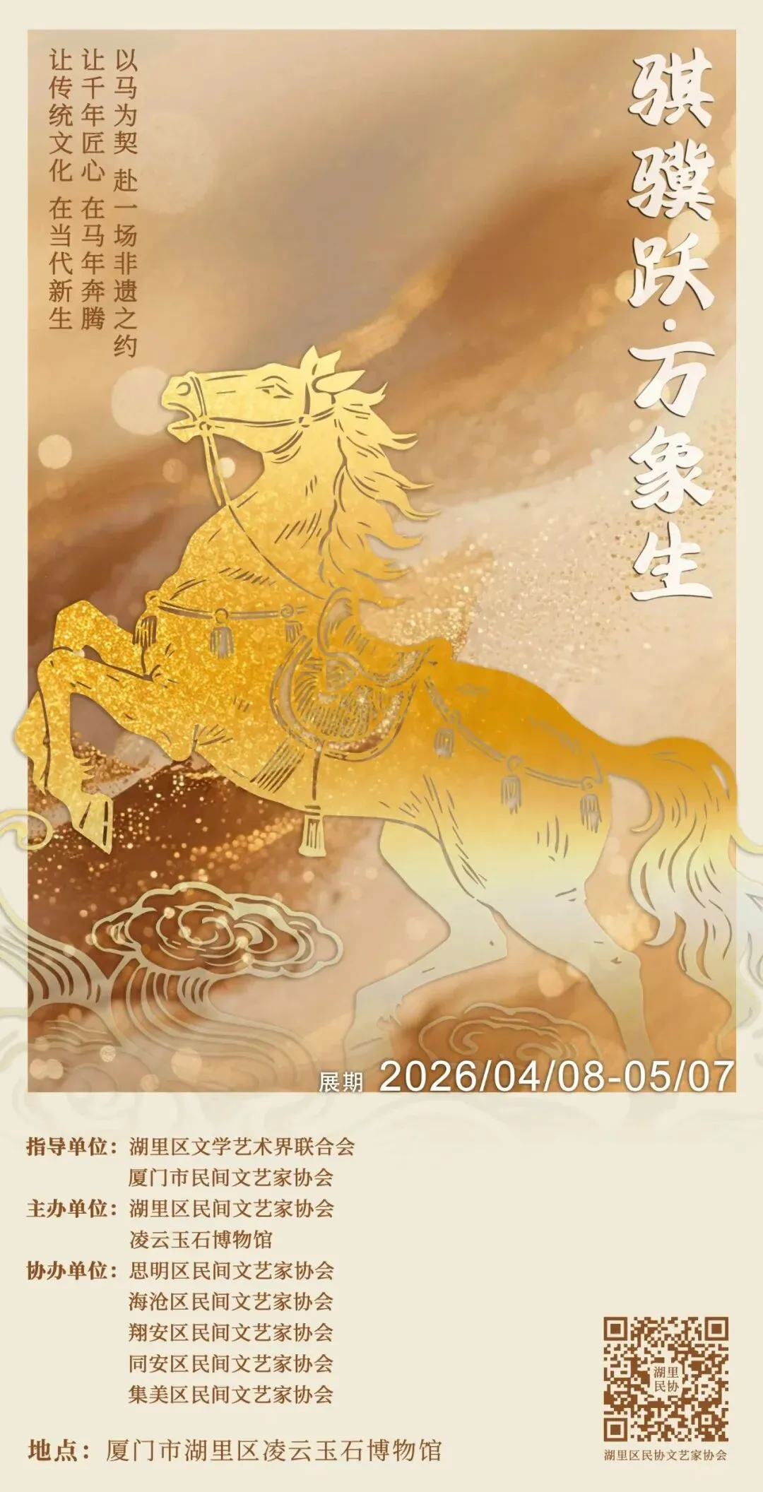 恰逢厦门经济特区建设45周年,“骐骥跃·万象生”湖里区民间艺术精品展,即将温情启幕;以马为媒,传匠心、映时代,汇聚民间艺术精品,解锁马年文化新体验,共赴一场匠心之约。