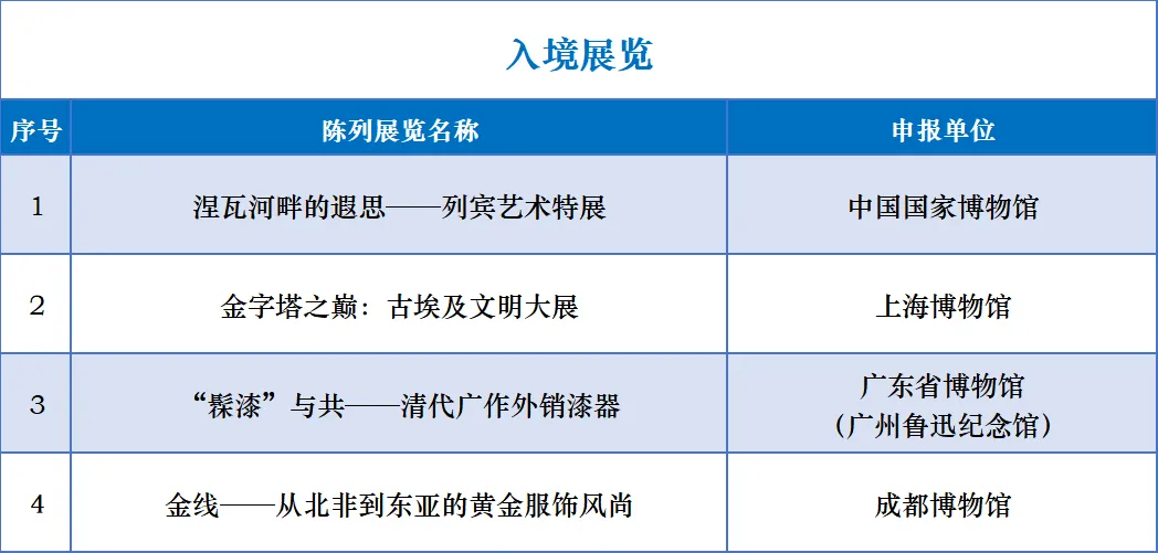 第二十三届(2025年度)全国博物馆十大陈列展览精品推介活动初评会于3月26日至28日在京召开。根据《全国博物馆十大陈列展览精品推介办法》,通过审阅申报材料、观看申报项目视频、讨论交流、实名投票等环节,初评评委会对150项申报项目进行了审核、遴选。经国家文物局核准,共计38项展览入围终评,其中境内展览30项,出境、入境展览各4项。现将入围终评项目向社会公示(名单附后)。