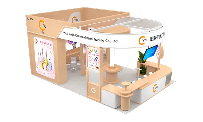 展台的结构呈弧形,这样的设计不仅增加了视觉上的流畅感,还使得整个空间显得更加开阔和具有动感。展台正面有一个接待台,上面印有公司的标志“YQ”,接待台后方是展示区。展示区的墙面上挂有大幅的宣传海报,展示了公司的主要产品,吸引参观者的目光。