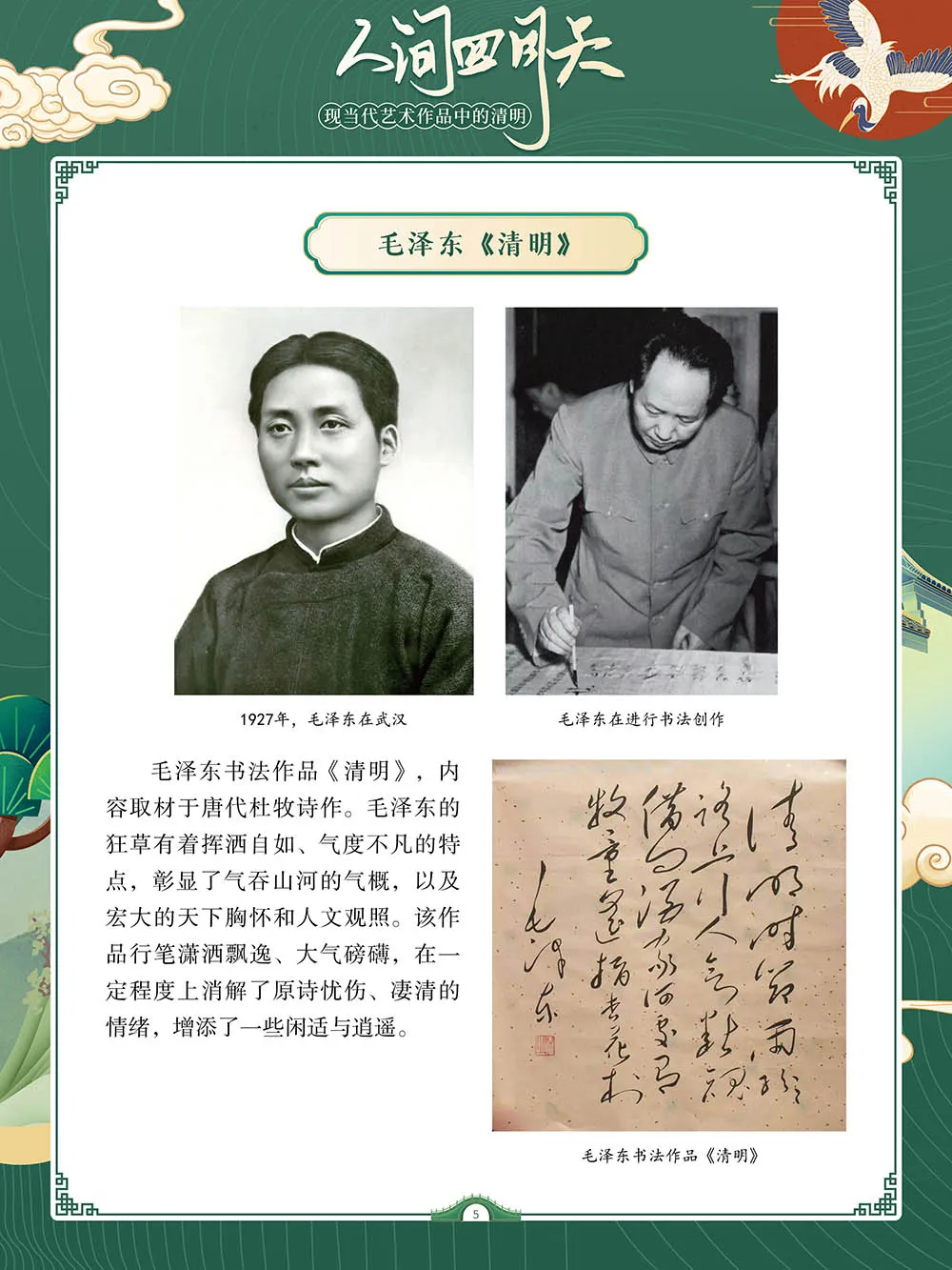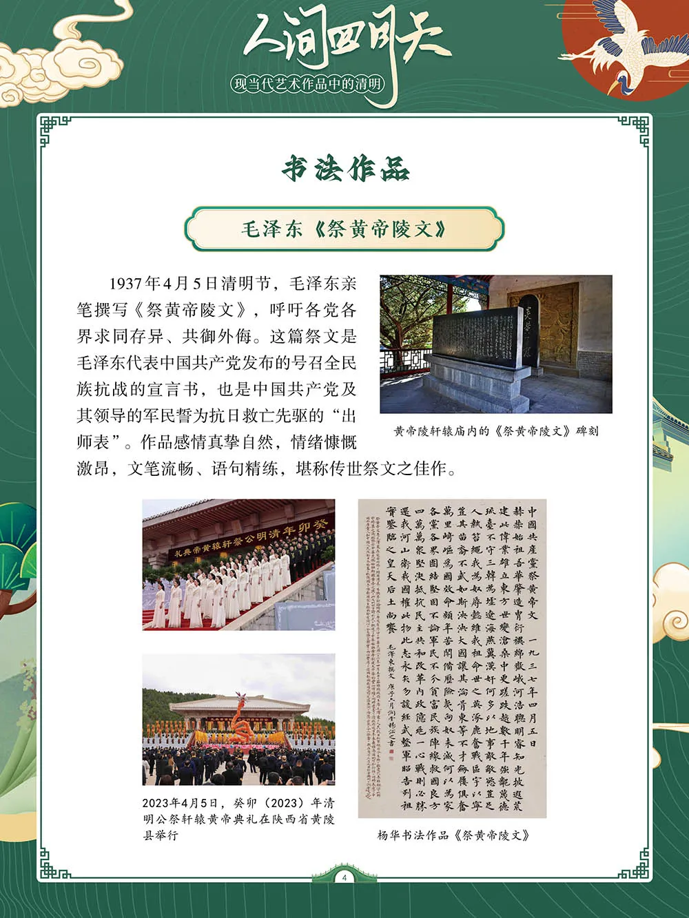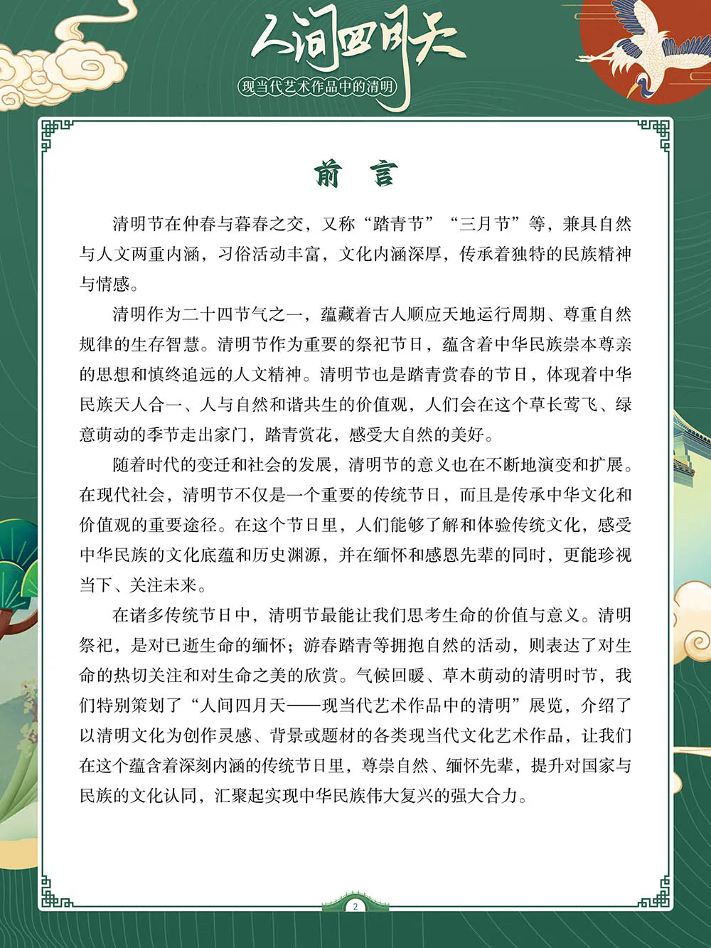 在这个节日里,人们能够了解和体验传统文化,感受中华民族的文化底蕴和历史渊源,并在缅怀和感恩先辈的同时,更能珍视当下、关注未来。“人间四月天——现当代艺术作品中的清明”展览介绍了以清明文化为创作灵感、背景或题材的各类现当代文化艺术作品,让我们在这个蕴含着深刻内涵的传统节日里,尊崇自然、缅怀先辈,提升对国家与民族的文化认同,汇聚起实现中华民族伟大复兴的强大合力。
