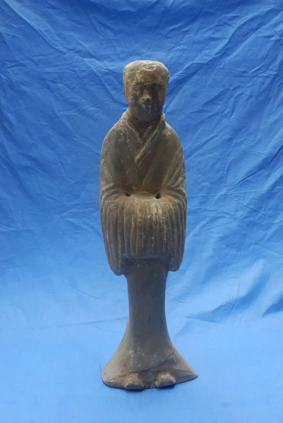 汉代陶塑,为泥质灰陶,通高60厘米。陶俑身着交领阔袖齐腰袍,发垂脑后,合拢扭结,阔眉朗目,神态自若,通身敷粉红色,1971年于阳信县一汉墓出土。