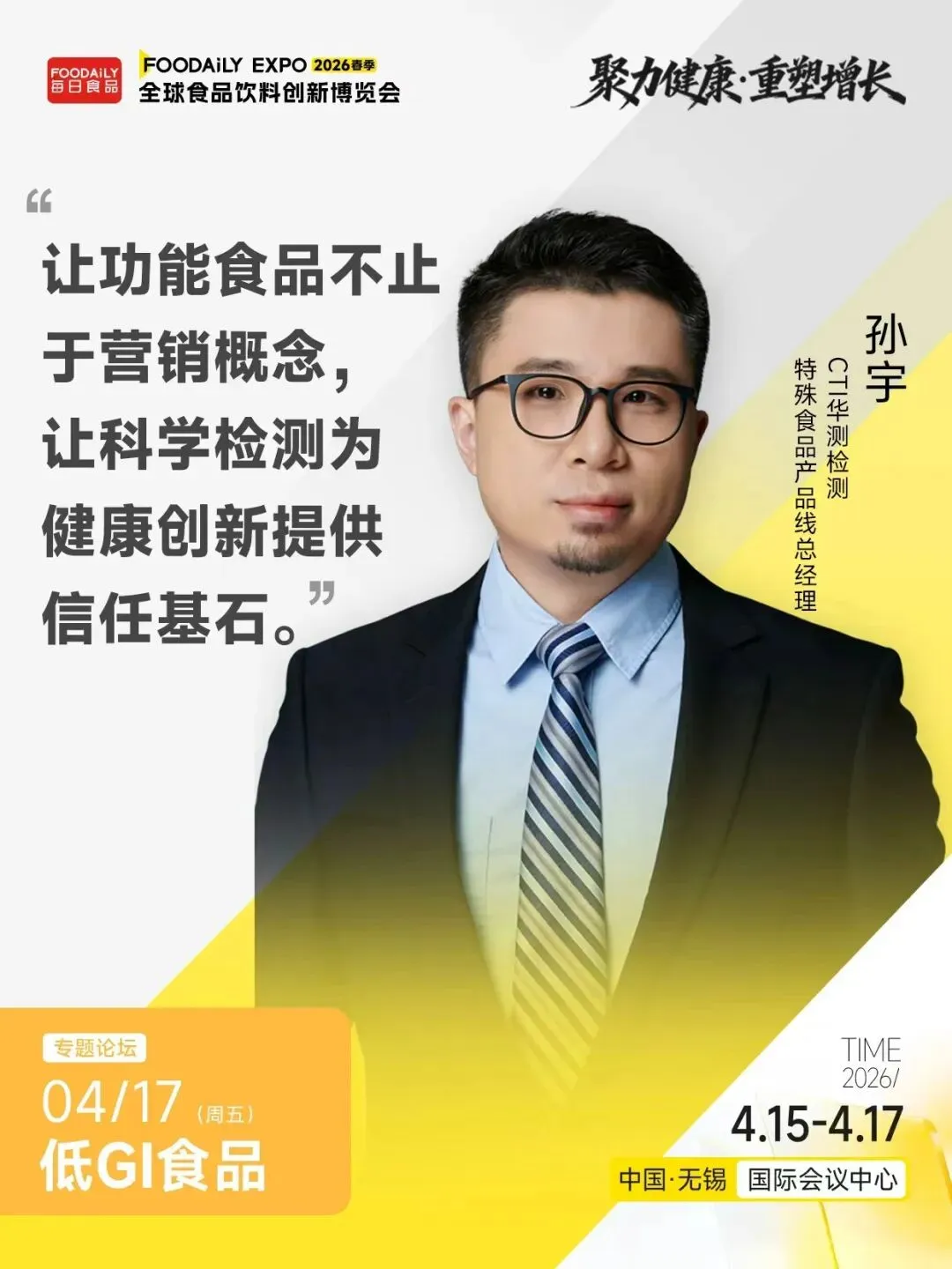 当“聚力健康·重塑增长”成为食品产业的时代强音,一场汇聚创新力量的行业盛会即将启幕。2026年4月15日-17日,Foodaily全球食品饮料创新博览会暨未来健康食品生态展将在无锡国际会议中心盛大召开。作为中国检测认证行业首家上市公司,CTI华测检测将携一站式大健康领域检测认证服务与前沿技术洞察亮相D39展位,并参与低GI食品领域核心圆桌论坛,与业界同仁共同探索食品健康化升级的品质路径与信任基石。