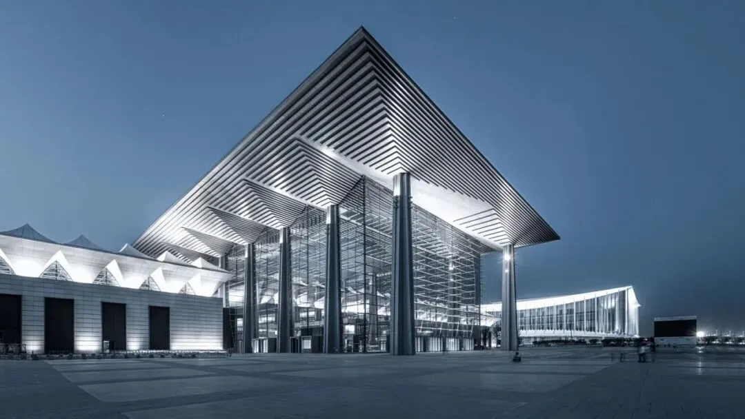 长焦压缩构图,强化会展建筑与城市天际线的融合
