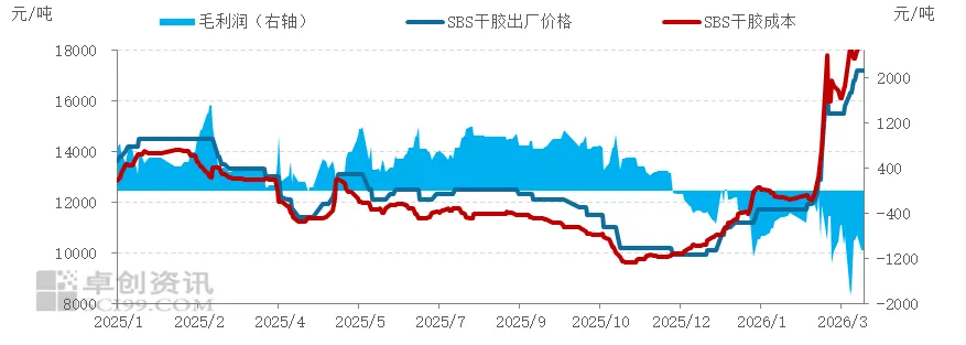 【导语】2026年3月以来,受国际局势及地缘政治影响,主要原料丁二烯价格高位运行,而SBS受需求拖累跟涨乏力,行业盈利空间持续收窄。截至3月31日,SBS理论生产毛利跌至-1060元/吨,较上月收盘下降820元/吨,降幅达341.67%。成本传导不畅叠加需求疲软,生产企业普遍陷入亏损。