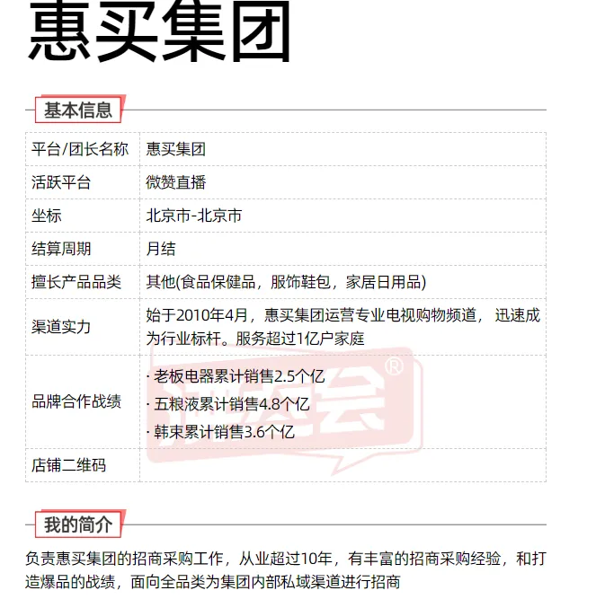惠买集团,坐标北京,微赞直播为主阵地,月结结算,擅长食品保健品、服饰鞋包、家居日用品。