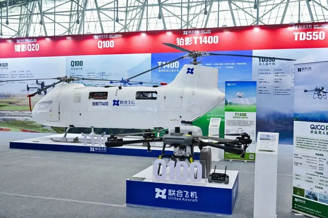 联合飞机(United Aircraft)带来铂影T1400纵列式无人直升机与Q100P农业无人机,将农耕精度控制在厘米级别,让“看天吃饭”正让位于“知天而作”。