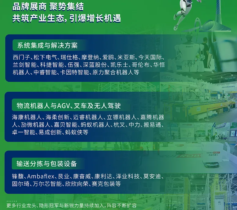 展会将全面展示物流装备与技术全产业链,聚焦从仓储、搬运、分拣到配送的全流程创新解决方案,汇聚全球行业领军品牌与本土标杆企业,形成覆盖核心技术、关键设备、系统集成的豪华参展阵容,让您一站式对接行业顶尖资源,洞察前沿技术成果。