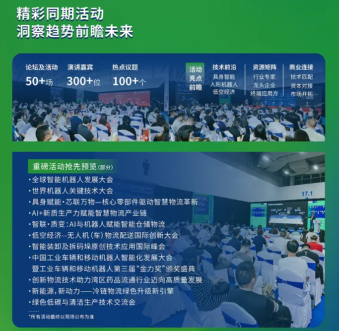 展会同期精心筹备 50 + 场专业论坛与活动,100 + 热点议题、300 +位演讲嘉宾,围绕具身 AI、人形机器人、低空经济、绿色冷链、AI + 新质生产力等热点话题展开深度探讨。