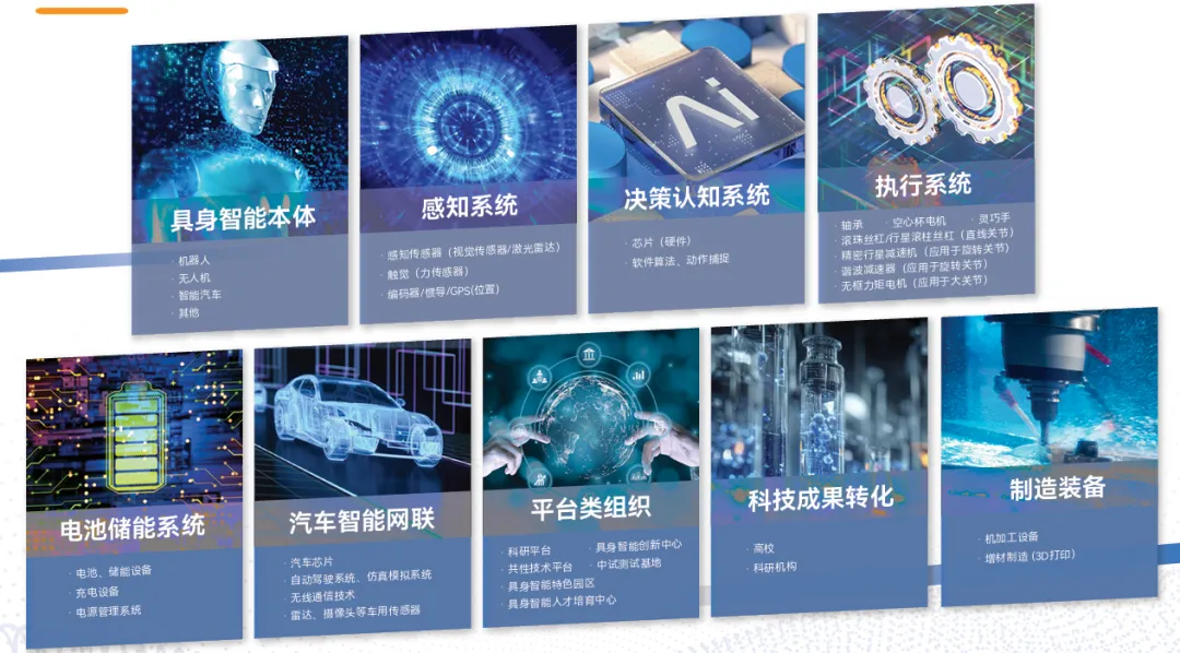 1.科研平台 2.数据采集平台3.具身智能创新中心 4.共性技术平台5.中试测试基地6.具身智能产业园区7.具身智能人才培育中心