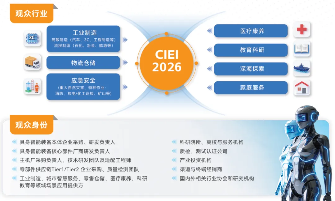 在CIEI2026,全球产业链资源将被高效链接,从关键技术、核心部件、系统集成到多元场景应用,形成闭环。我们全力推动人机协同从概念走向广泛落地,加速产业生态的系统性升级,共同缔造一场定义智能装备未来图景的世界级思想与产业盛宴。CIEI2026 --以具身之名,赋能当下,智见未来,共创下一轮增长纪元。
