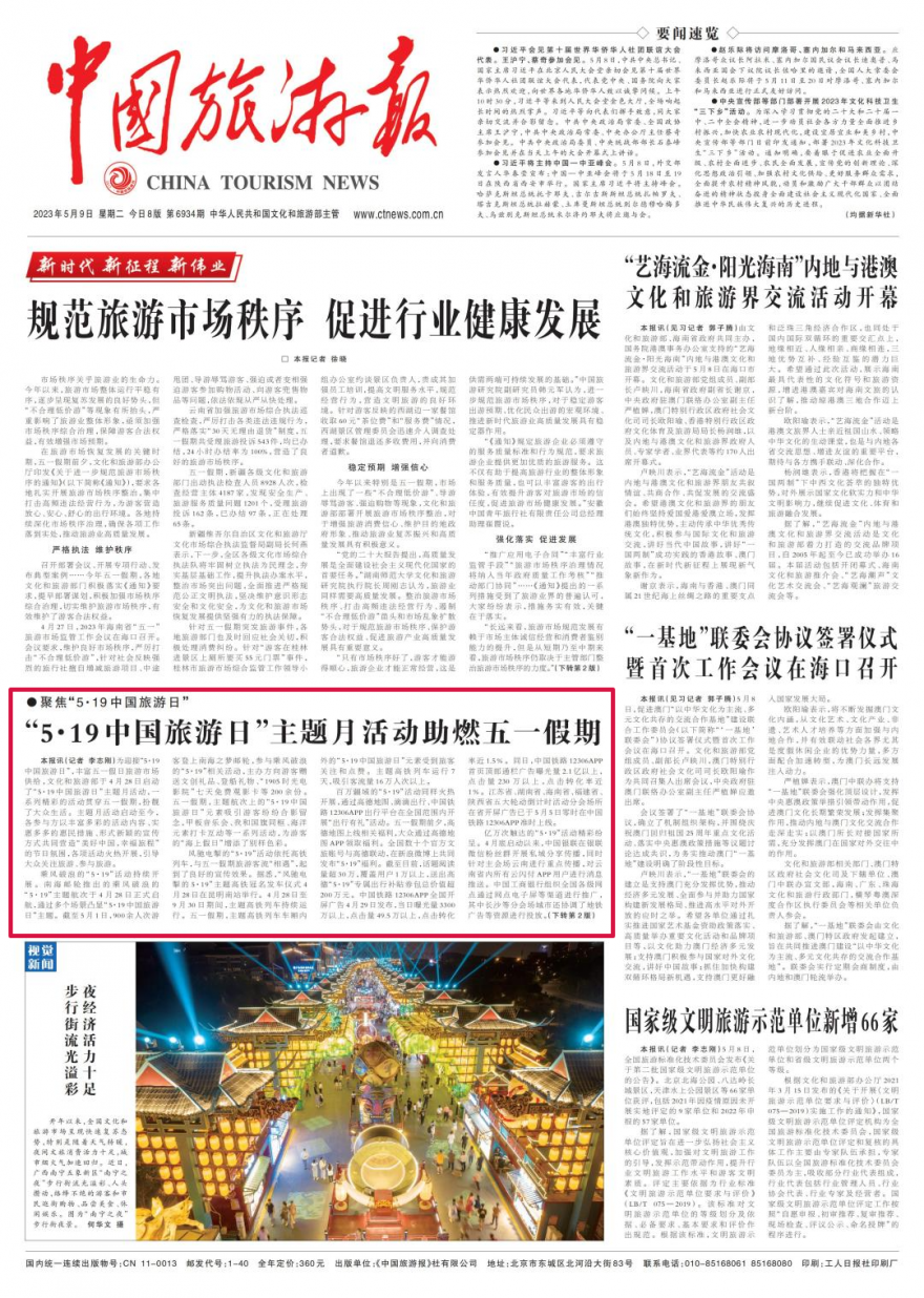 为迎接“5·19中国旅游日”,丰富五一假日旅游市场供给,文化和旅游部于4月28日启动了“5·19中国旅游日”主题月活动,一系列精彩的活动贯穿五一假期,扮靓了大众生活。主题月活动启动至今,各参与方以丰富多彩的活动内容、实惠多多的惠民措施、形式新颖的宣传方式共同营造“美好中国,幸福旅程”的节日氛围,各项活动火热开展,引导大众关注旅游、参与旅游。乘风破浪的“5·19”活动持续开展。南海邮轮推出的乘风破浪的“5·19”主题航次于4月28日正式启航,通过多个场景凸显“5·19中国旅游日”主题。截至5月1日,900余人次游客登上南海之梦邮轮,参与乘风破浪的“5·19”相关活动,主办方向游客赠送文创礼品、登船礼物、“1905时光电影院”七天免费观影卡等200余份。五一假期,主题航次上的“5·19中国旅游日”元素吸引游客纷纷合影留念,甲板音乐会、我和国旗同框、海洋元素打卡互动等一系列活动,为游客的“海上假日”增添了别样色彩。