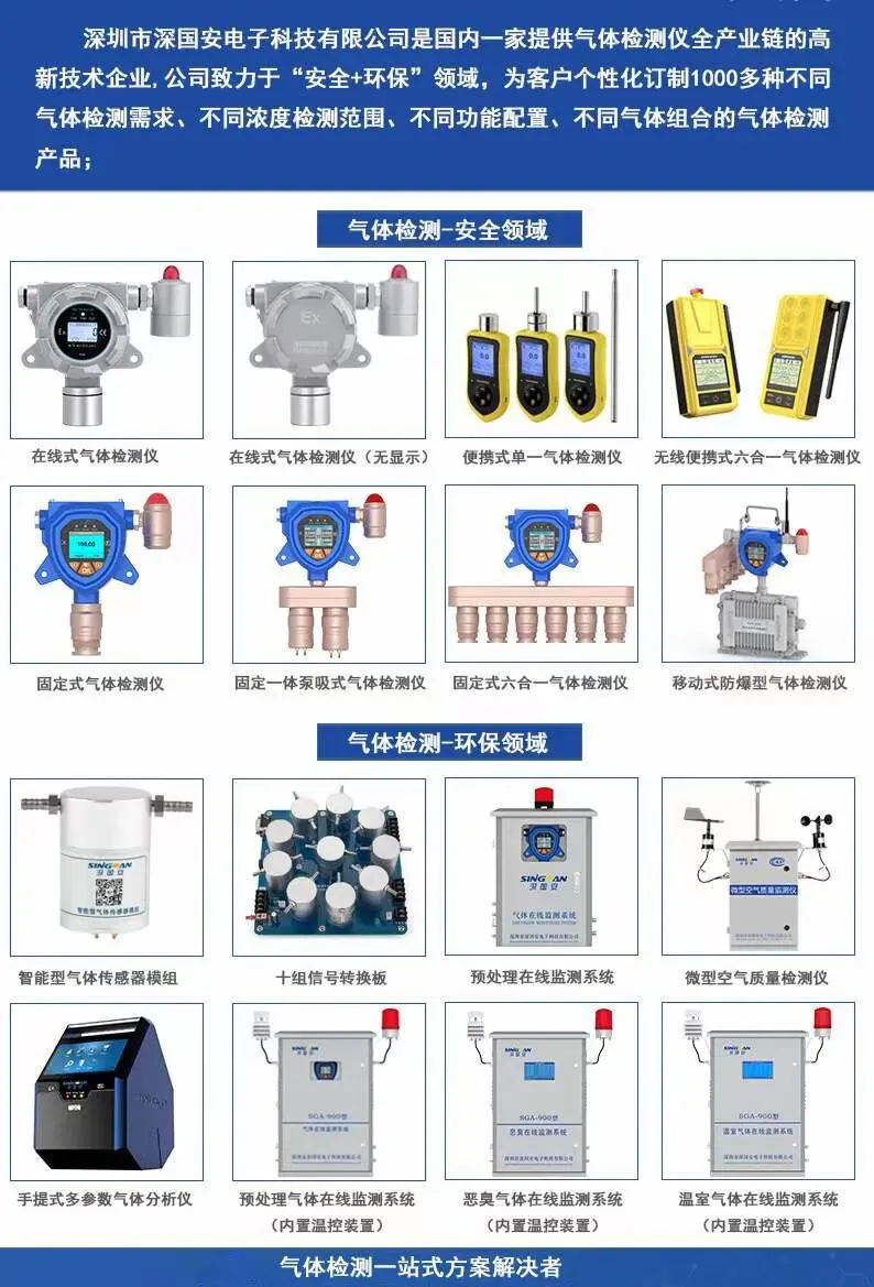 深圳市深国安电子科技有限公司成立于2013年,是一家专业提供气体检测全产业链的国家高新技术企业;2019年在前海股权交易中心成功挂牌,企业代码:681434;公司专注于“安全+环保”两大领域,为客户个性化订制1000多种不同气体检测需求、不同浓度检测范围、不同功能配置、不同气体组合的安全仪表和环境监测设备;涵盖气体传感器、智能气体传感器模组、气体检测模块、固定式气体检测仪、便携式气体检测仪、手提式气体分析仪、气体在线监测系统、物联网监控平台在内的八大系列、10000余款易燃易爆、有毒有害和挥发性气体检测产品。广泛应用于石油、化工、冶金、钢铁、电力、环保、消防、新能源、无人机、工业机器人等200多个应用场景。致力于为客户提供一站式气体检测解决方案。咨询电话:0755-85258900