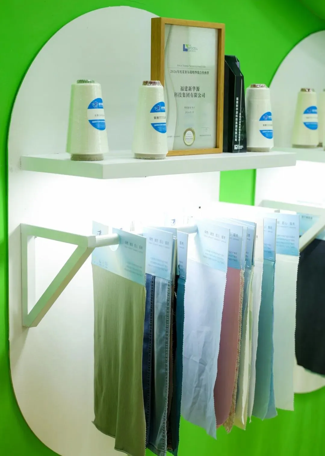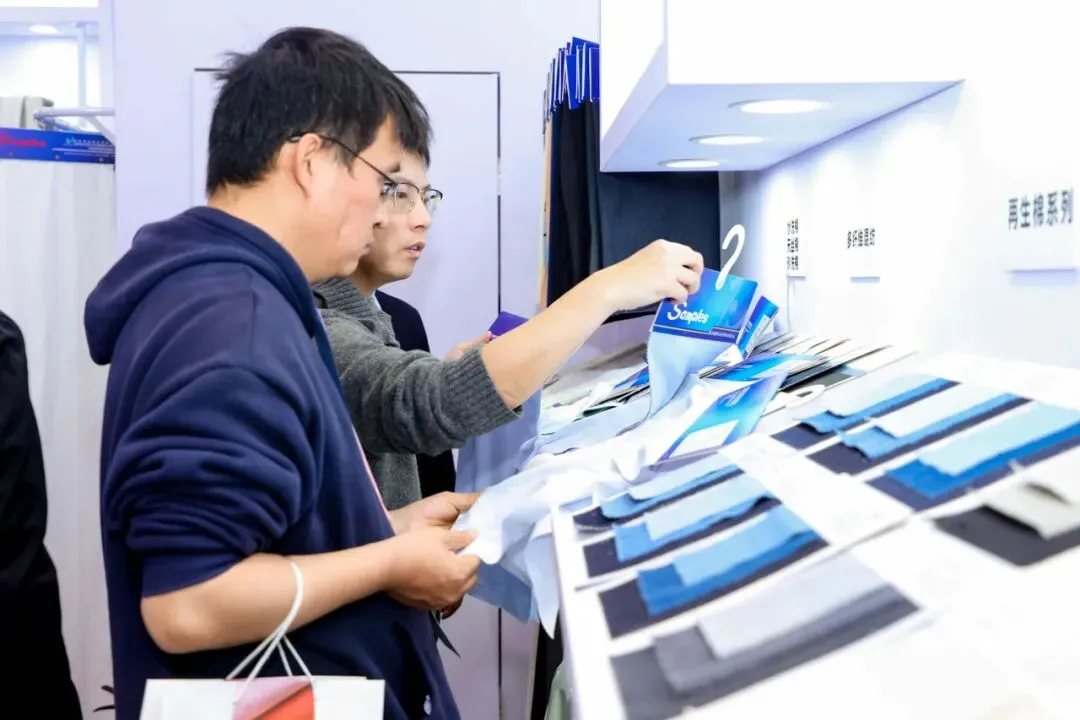 赛得利展团依托莱赛尔纤维项目的产业优势,展出绿色再生纤维素纤维全系列产品,凭借世界领先的产能与技术水平,吸引了大批下游面料企业与品牌商洽谈合作,为莱赛尔纤维的规模化应用拓展了广阔市场空间。通用技术新材展团以“纤启新程 织绘未来”为主题,展出原位聚合原液着色聚酯、阻燃型莱赛尔纤维等前沿产品,现场举办多场战略合作签约仪式,与德国Smartfiber、美国ABW等国际企业达成合作,还斩获行业多项荣誉,数千名全球专业观众到场洽谈,成为展会的焦点展团。华西村展团则携手新泽源、鑫凤织造等涡流纺企业联合参展,全方位展示涤纶短纤及其纱线的品质内核,实现上下游企业协同展示,现场达成多项供应链合作意向,有效推动了涤纶短纤产业的协同发展。