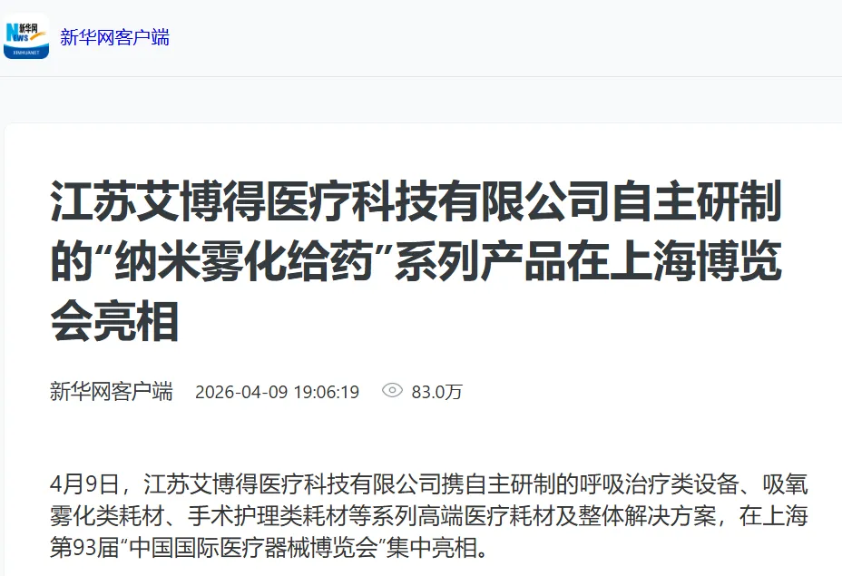 4月9日-12日,第93届中国国际医疗器械(春季)博览会(CMEF)在上海国家会展中心火热进行中。江苏艾博得医疗器械有限公司携全谱系呼吸治疗产品重磅亮相,凭借硬核的技术实力与全场景产品矩阵,持续引爆展会热度,相关报道在新华网客户端上线仅1天,点击量便突破80万,引发行业广泛关注。
