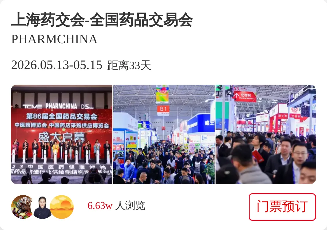 第92届全国药品交易会(PHARMCHINA)系列展及医疗、大健康板块系列品牌展将于5月13-15日在上海国家会议中心举行。门票观众预登记火热进行中~提前预登记免排队入场。更多展会详情咨询聚展~