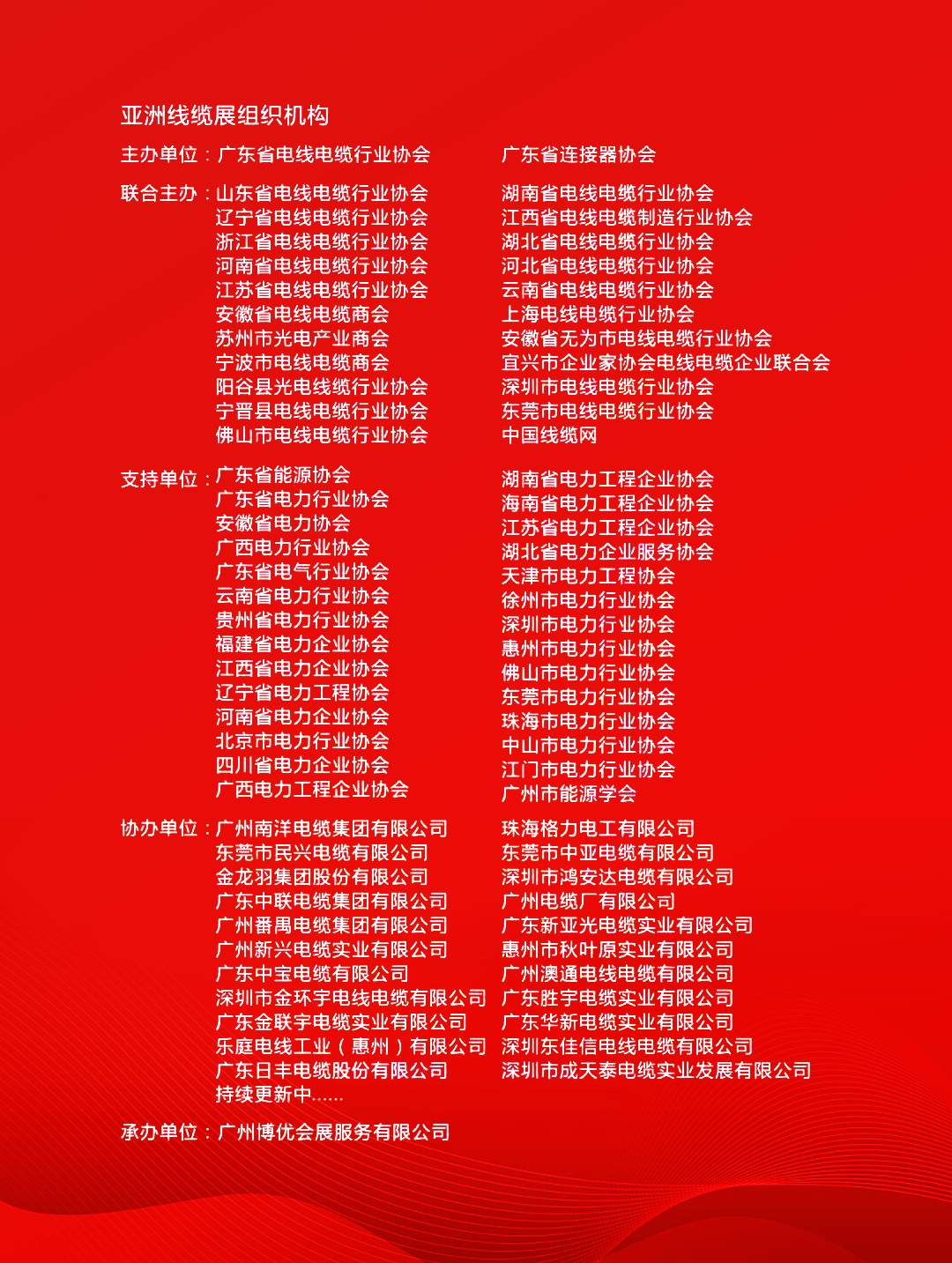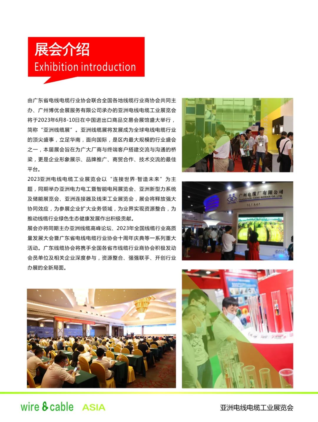 由广东省电线电缆行业协会、广州博优会展服务有限公司联合全国各省市23家线缆行业商协会共同主办、众多专业权威机构及业界名企支持协办的亚洲电线电缆工业展览会将于6月8日-10日在中国进出口商品交易会展馆举行,简称“亚洲线缆展”。亚洲线缆展将发展成为全球电线电缆行业的顶尖盛事,立足华南,面向国际,是区内最大规模的行业盛会之一,本届展会旨在为广大厂商与终端客户搭建交流与沟通的桥梁,更是企业形象展示、品牌推广、商贸合作的最佳平台。2023亚洲线缆展以“连接世界·智造未来”为主题,同期举行由中国南方电网有限责任公司指导主办的亚洲电力电工暨智能电网展览会、亚洲新型电力系统及储能展览会,以及亚洲连接器及线束工业展览会,展会将释放强大协同效应,为参展企业扩大业务领域,为业界实现资源整合,为推动线缆行业绿色生态健康发展作出积极贡献。展会同期亦将主办亚洲线缆高峰论坛、2023年全国线缆行业高质量发展大会暨广东省电线电缆行业协会十周年庆典等一系列重大活动。展会各联合主办单位、支持协办单位将携手积极发动会员单位及线缆相关企业深度参与,资源整合、强强联手、开创行业办展的全新局面。