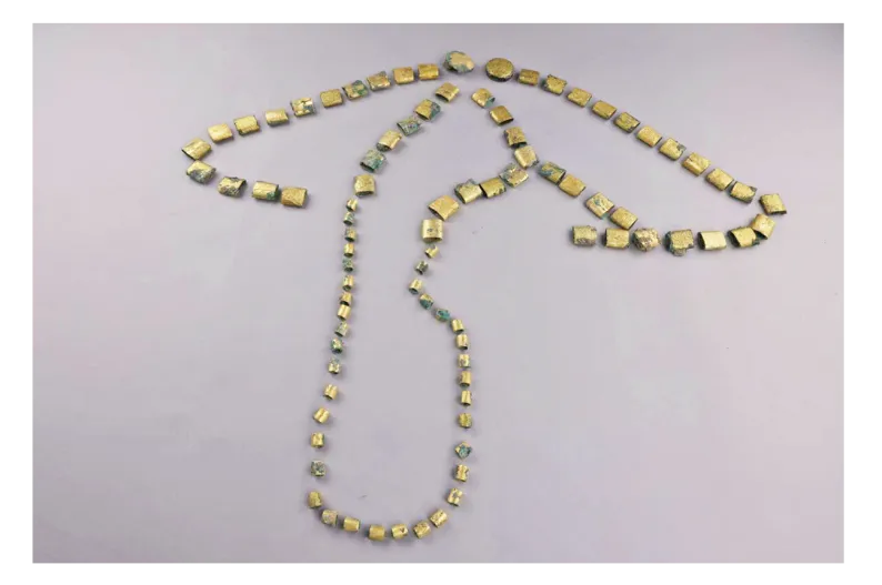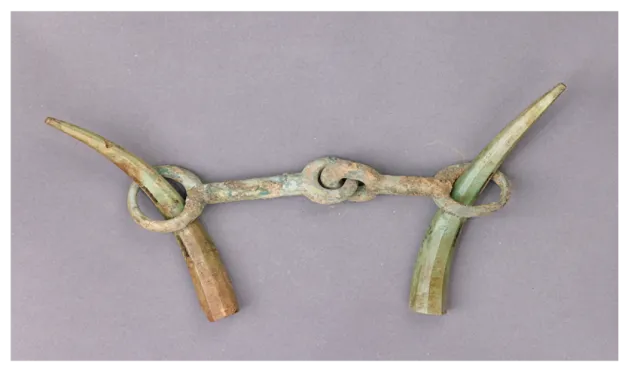 林州市博物馆藏 战国 铜马衔、骨镳马衔由两个“8”字形铜环套接而成,端环呈椭圆形。骨镳:骨质,呈角状,共两件,形制、大小、纹饰基本相同。器身表面光滑,一端较粗,一端较细,侧面有两个长方形穿孔,表面上绘有褐色重环纹。纹饰模糊不清,有磨损痕迹。